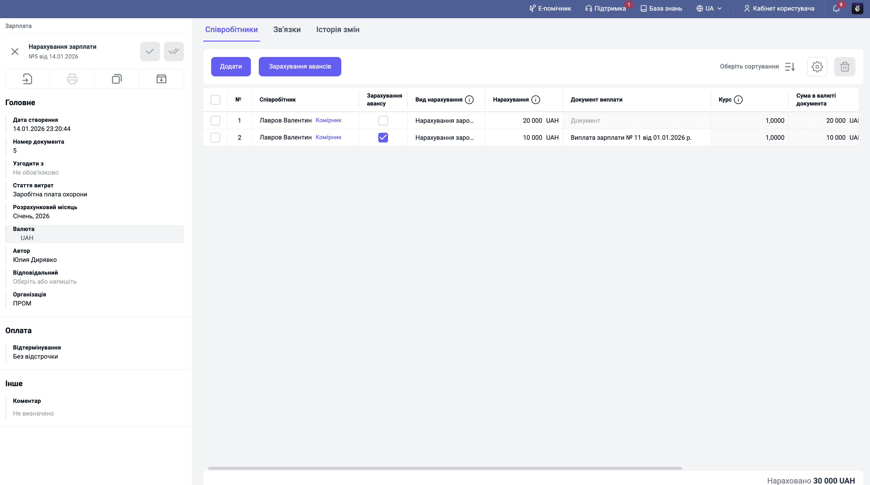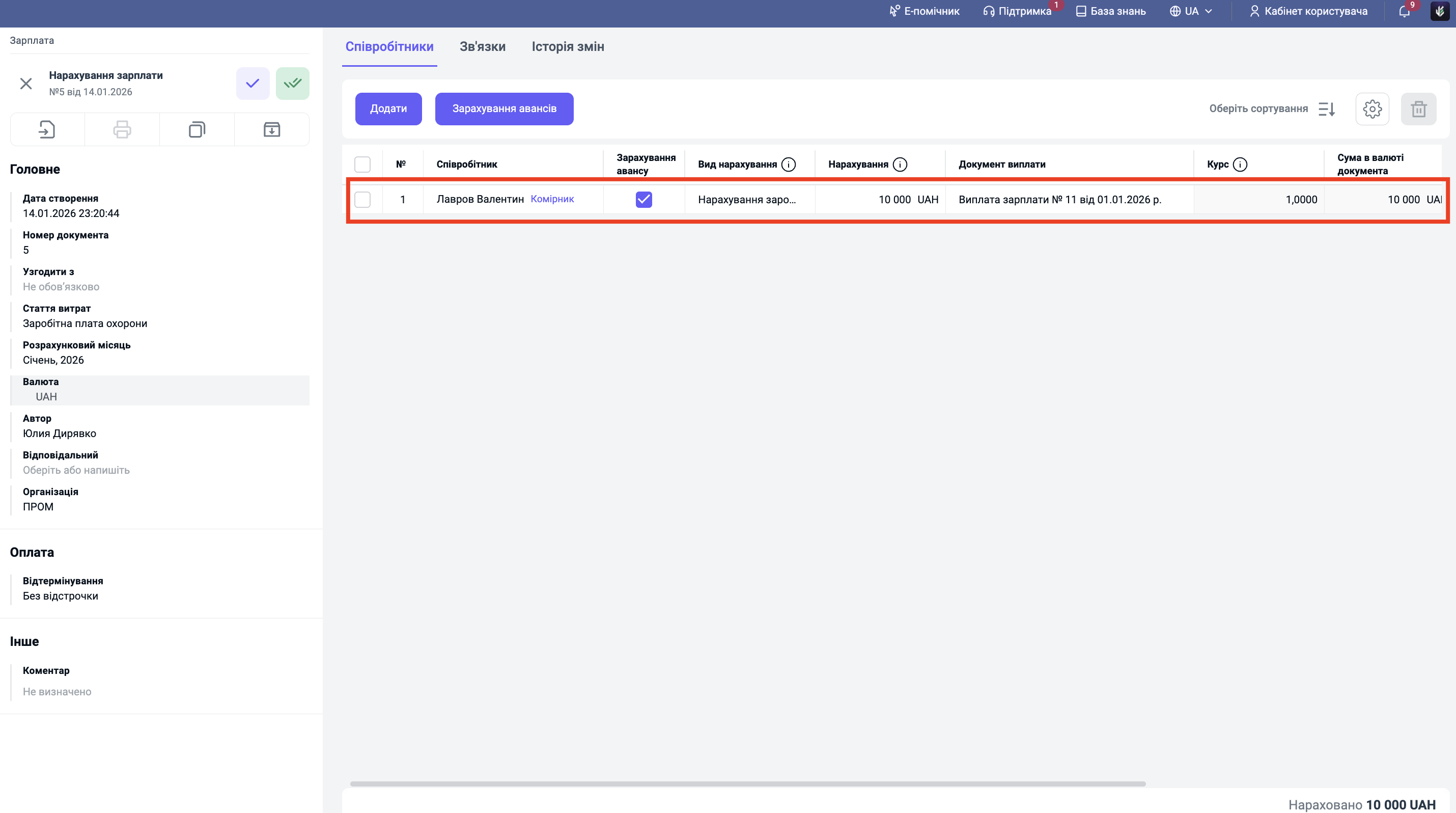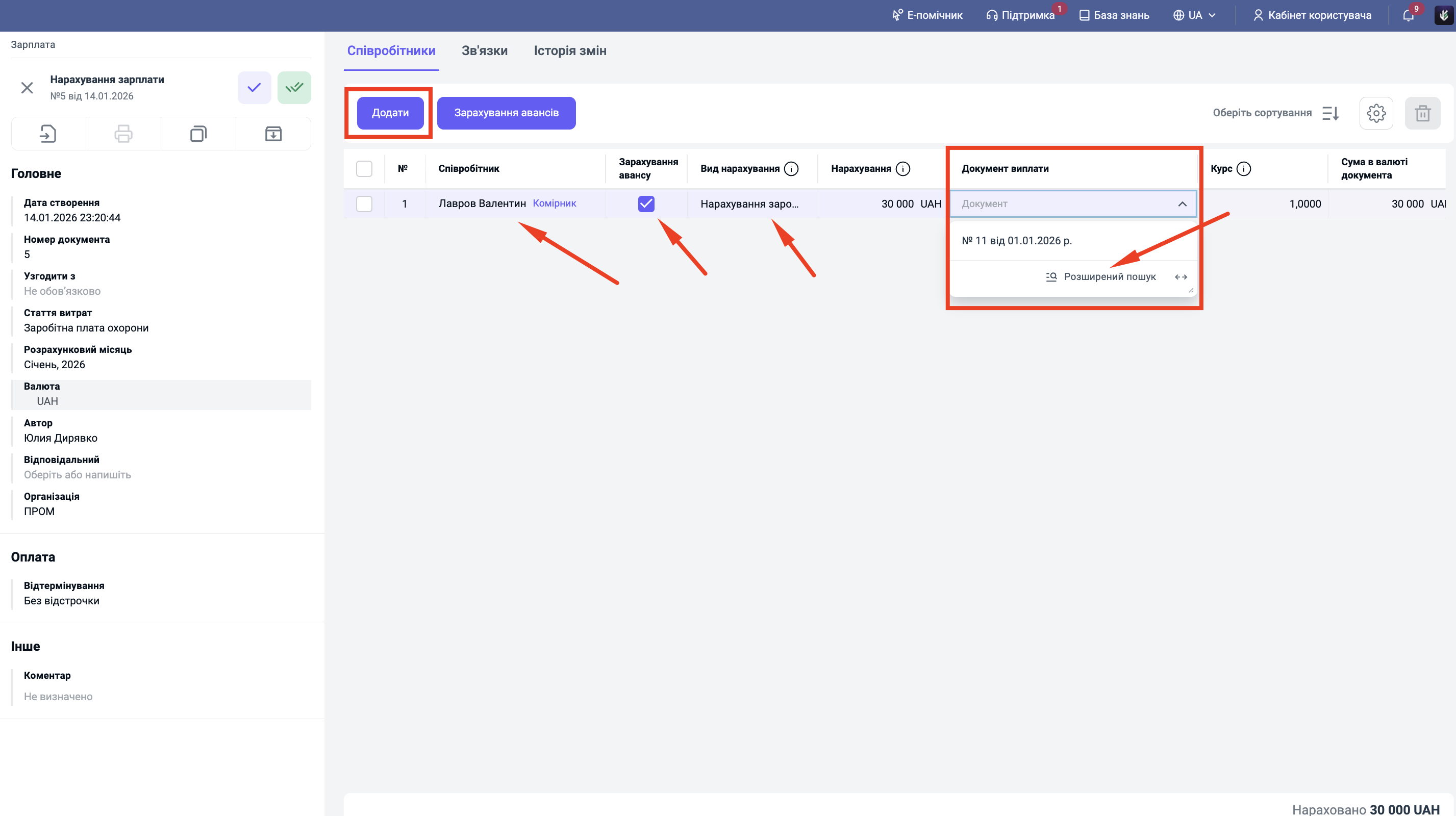 Результат: Система автоматично створить рядки у таблиці по обраним співробітникам, прив'язавши їх до документів виплати. Борг співробітників за отримані аванси закриється.