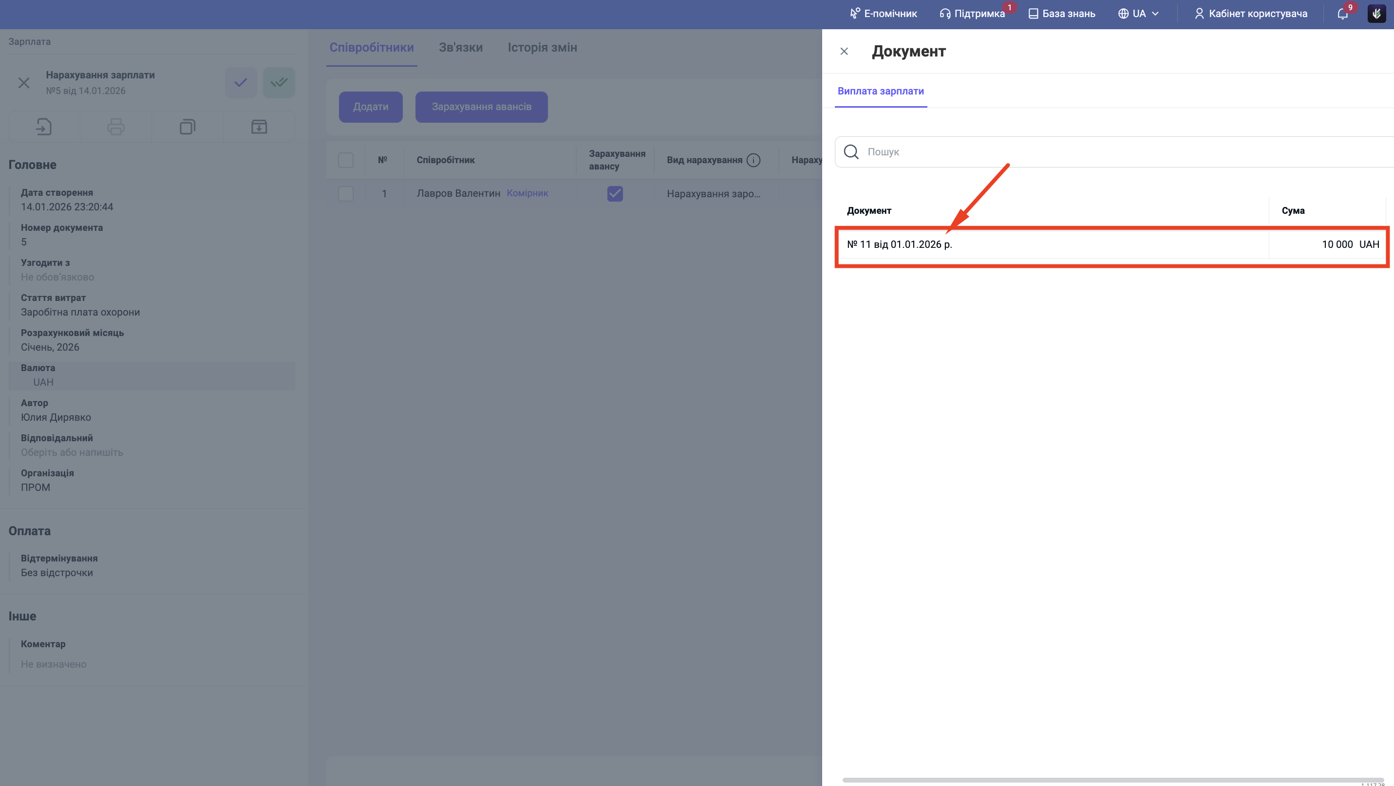 Праворуч відкриється вікно "Документ" з переліком виплат. Знайдіть потрібну виплату (орієнтуйтесь на дату та суму) і клікніть на неї — вона підтягнеться в рядок.