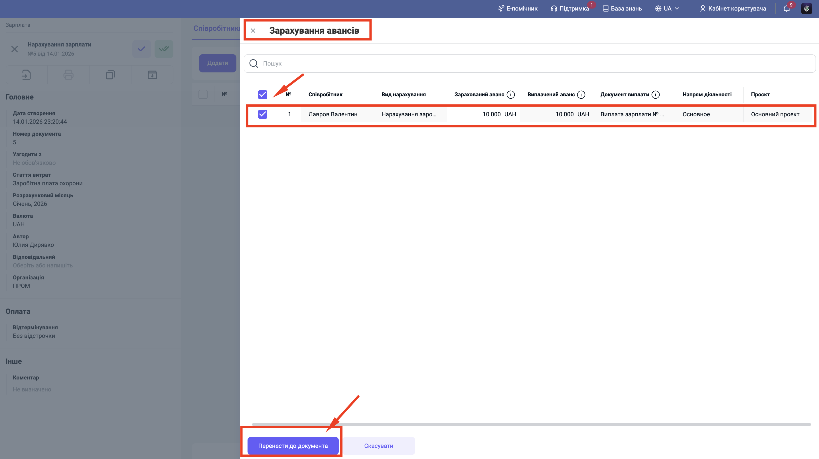 Поставте галочки (чекбокси) напроти тих авансів, які ви хочете врахувати у поточному нарахуванні.